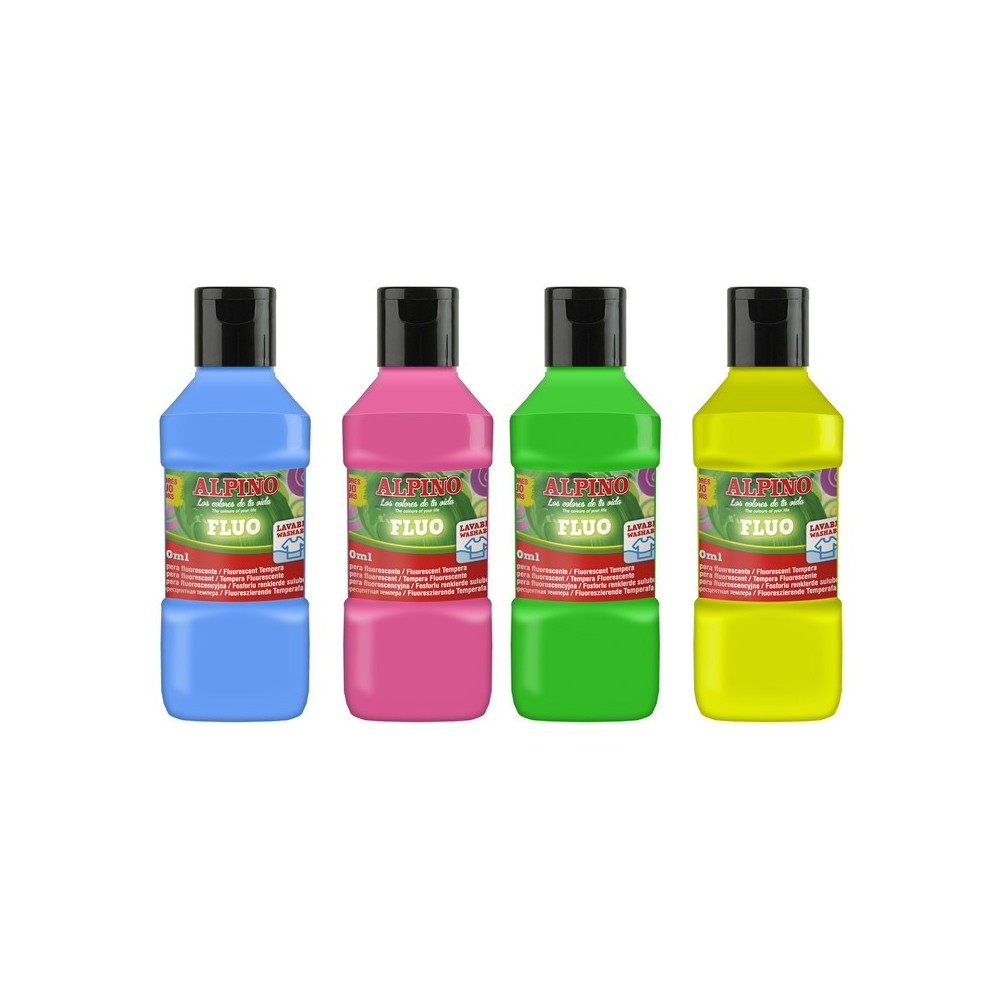 Tempera lavabila, fluorescenta, 4 culori x 250ml/cutie, Alpino