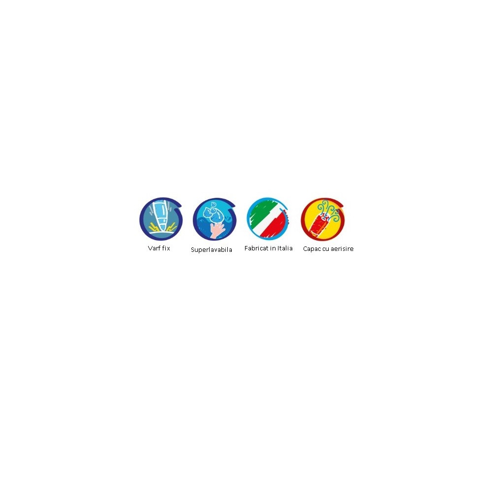 •Fiecare cutie contine 18 carioci cu cerneala lavabila, cu varf care se blocheaza si capac cu ventilatie.