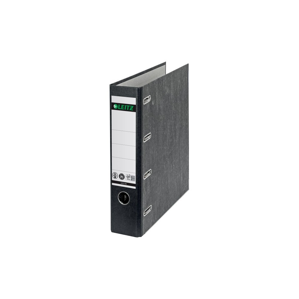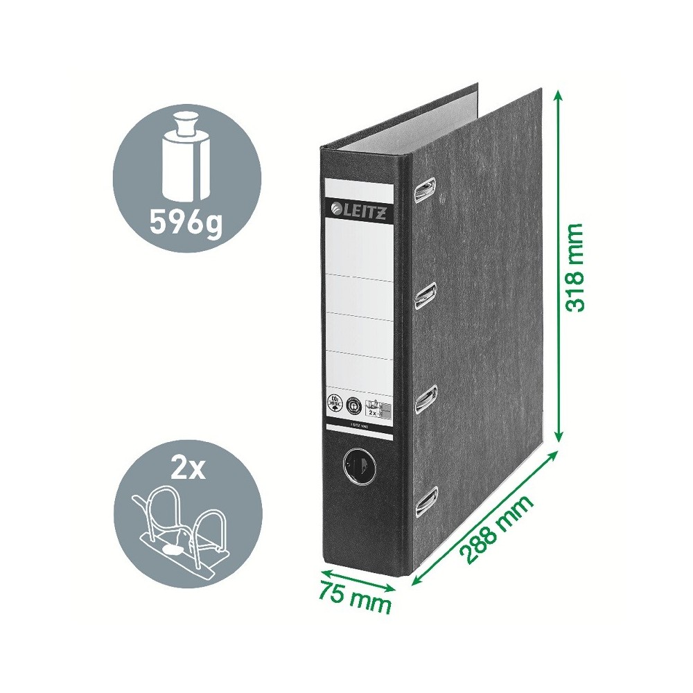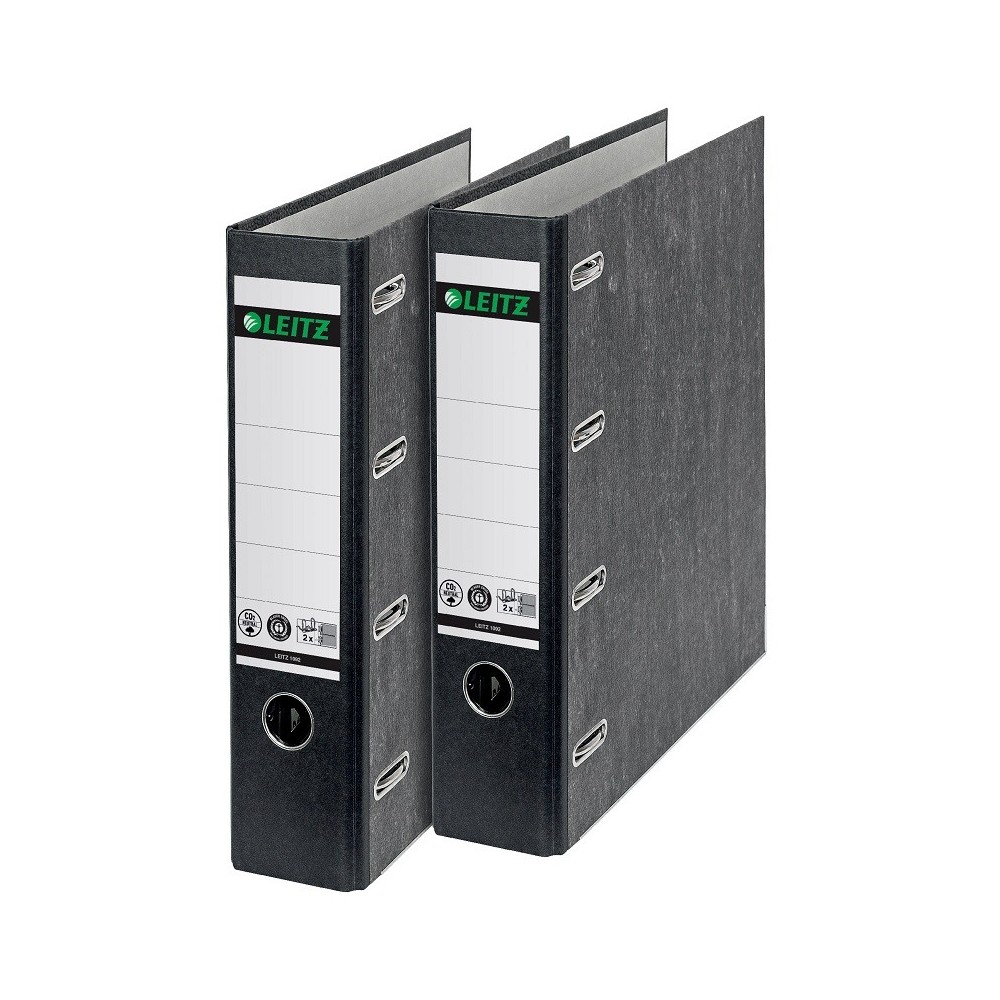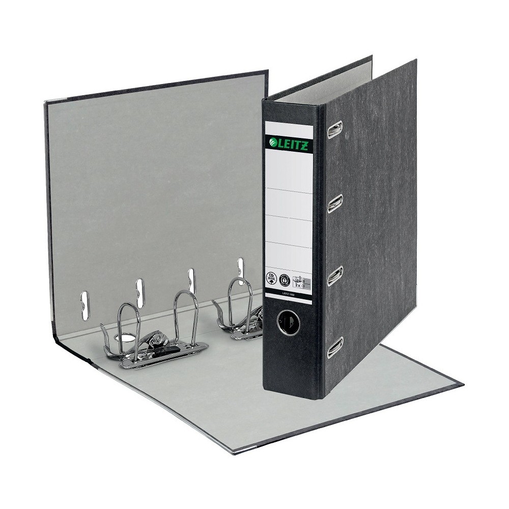 2 mecanisme Leitz cu deschidere 180°, pentru arhivare pe ambele parti ale mecanismului, cu 20% mai rapida decat de obicei. Carton marmorat rigid, rezistent la zgarieturi si uzura. Dotat cu 4 inele rado, sina metalica si orificiu de prindere pe cotor, pentru o manevrare facila. Eticheta autoadeziva pe cotor