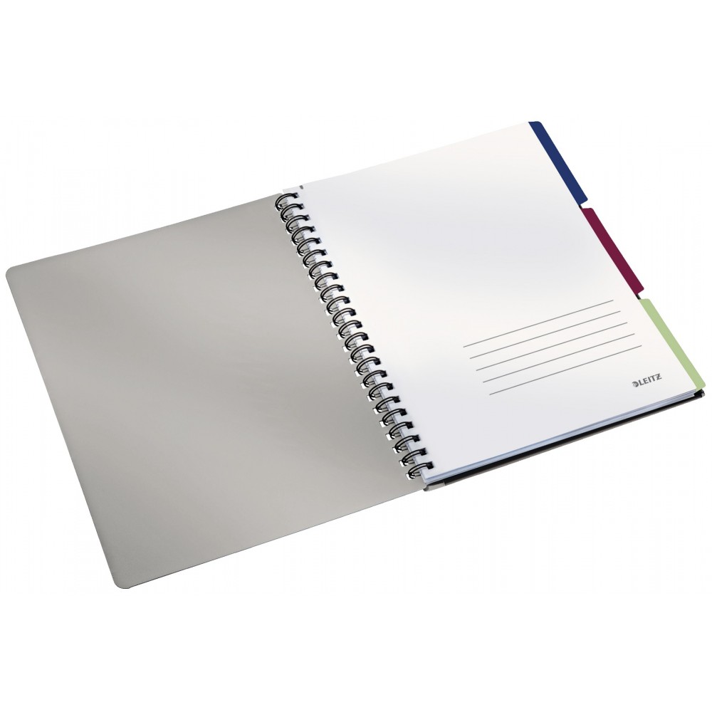 Caiet elegant Leitz, cu coperta intr-un design modern. Potrivit pentru a lua notite in miscare si pentru organizarea optima a proiectelor. Usor de rasfoit, datorita spirei cu deschidere 360 grade. 3 separatoare repozitionabile, pentru organizarea proiectelor.