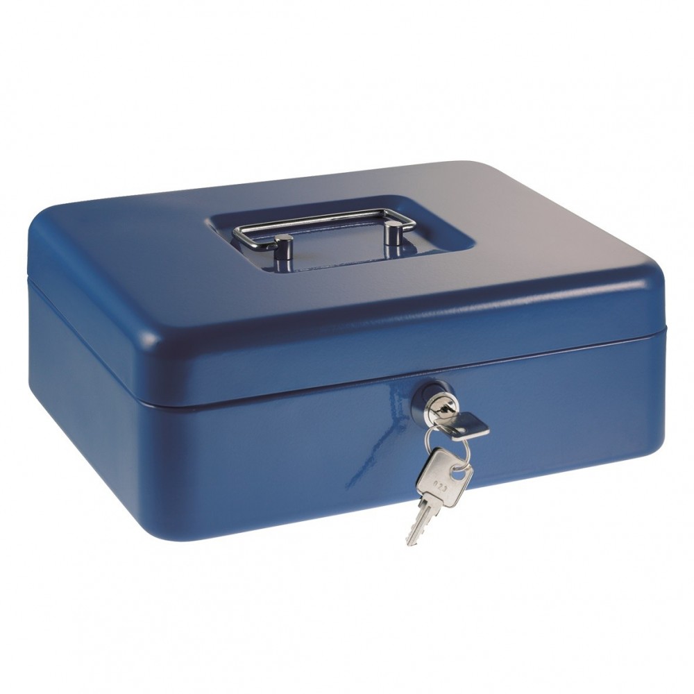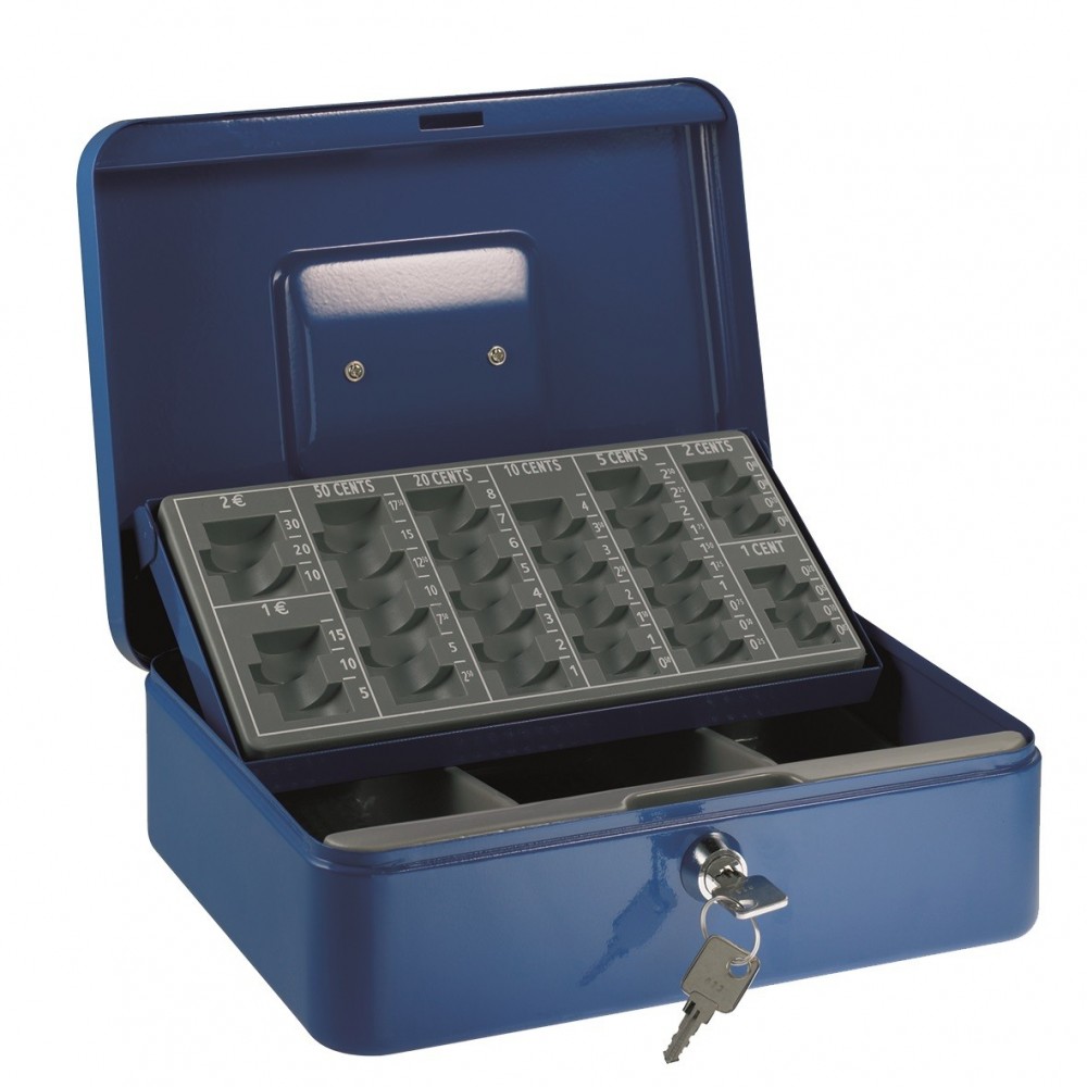 Caseta (cutie) metalica pentru bani, 250 x 180 x 90 mm, tavita monezi euro, ALCO - albastra