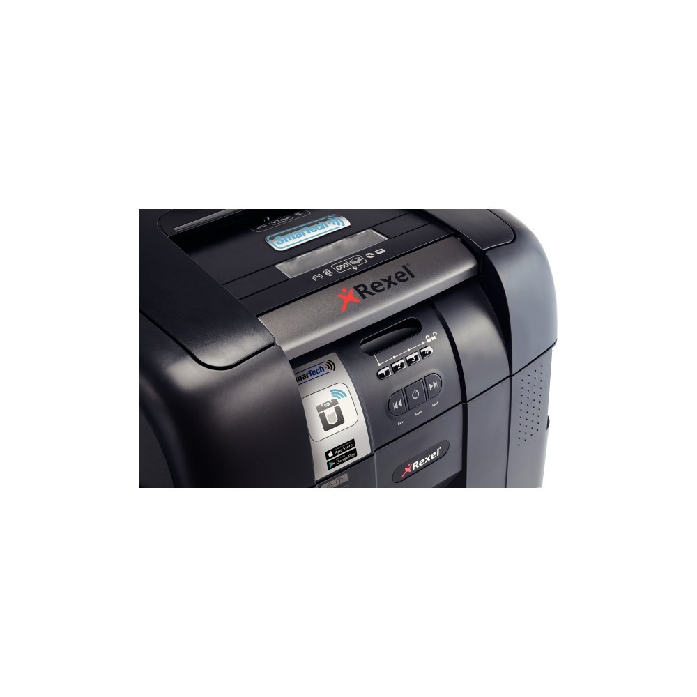 • Distrugatorul pentru documente Auto+ 600X SmarTech distruge automat pana la 600 coli (80gsm) sau 660 coli (70gsm), in bucati cross cut, nivel de securitate P-4 (4x40mm).