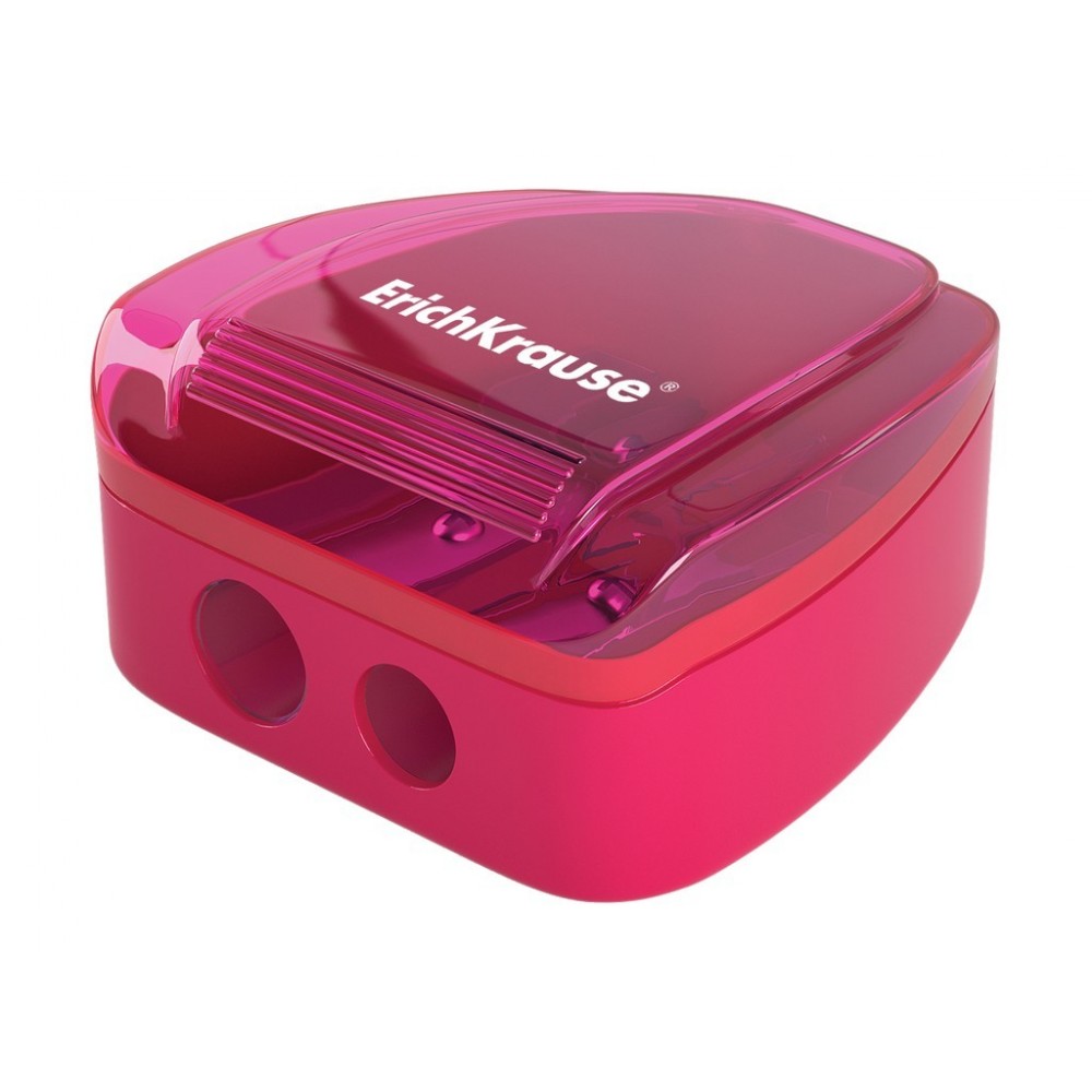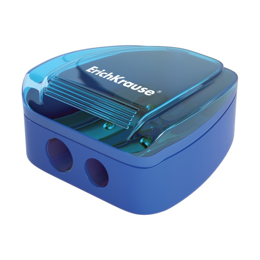Ascuțitoare dublă din plastic cu container pentru reziduuri. Multiple unghiuri de ascuțire.