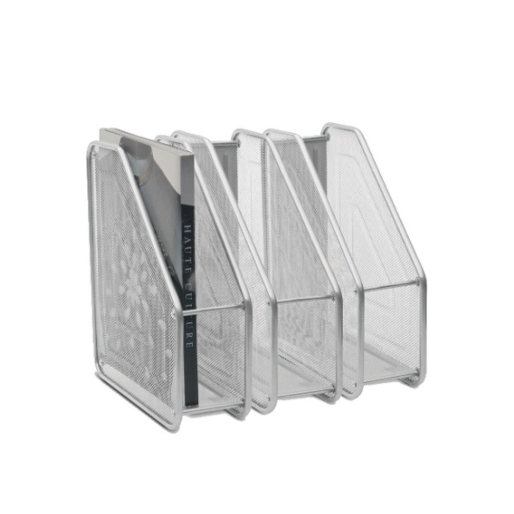 Suport din metal pentru păstrat reviste.Împreună cu celelalte produse din gama office, se poate realiza un set complet pentru birou Material: plasă metalică Dimensiuni: 75 x 290 x 310 mm
