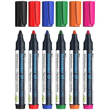 Marker SCHNEIDER Maxx 290, pentru tabla de scris+flipchart, varf rotund 2-3mm, 6 cul/set - (N,R,A,V,